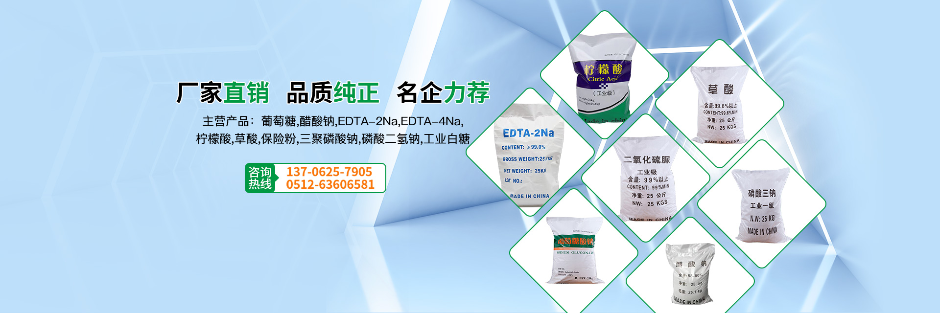 我公司主要主营葡萄糖,醋酸钠,EDTA二钠,EDTA四钠,柠檬酸,草酸,保险粉,三聚磷酸钠,磷酸二氢钠,工业白糖。